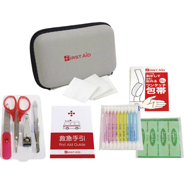 【仕様】 ケースサイズ:117×78×33mm 重量:78g 内容:収納ケース、絆創膏5P、ワンタッチ包帯、綿棒10P、コットンパフ3P、救急手引、爪切り、はさみ、毛抜き、爪やすり