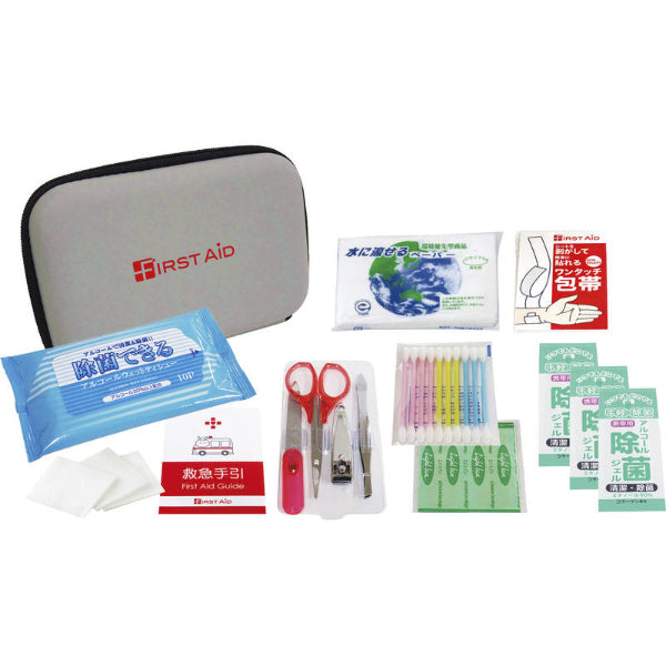 【仕様】 ケースサイズ:165×110×38mm 重量:200g 内容:収納ケース、絆創膏5P、ワンタッチ包帯、綿棒10P、救急手引、水に流せるペーパー、除菌ジェル×3、除菌アルコールウェットティッシュ、コットンパフ3P、爪切り、はさみ、爪やすり、毛抜き