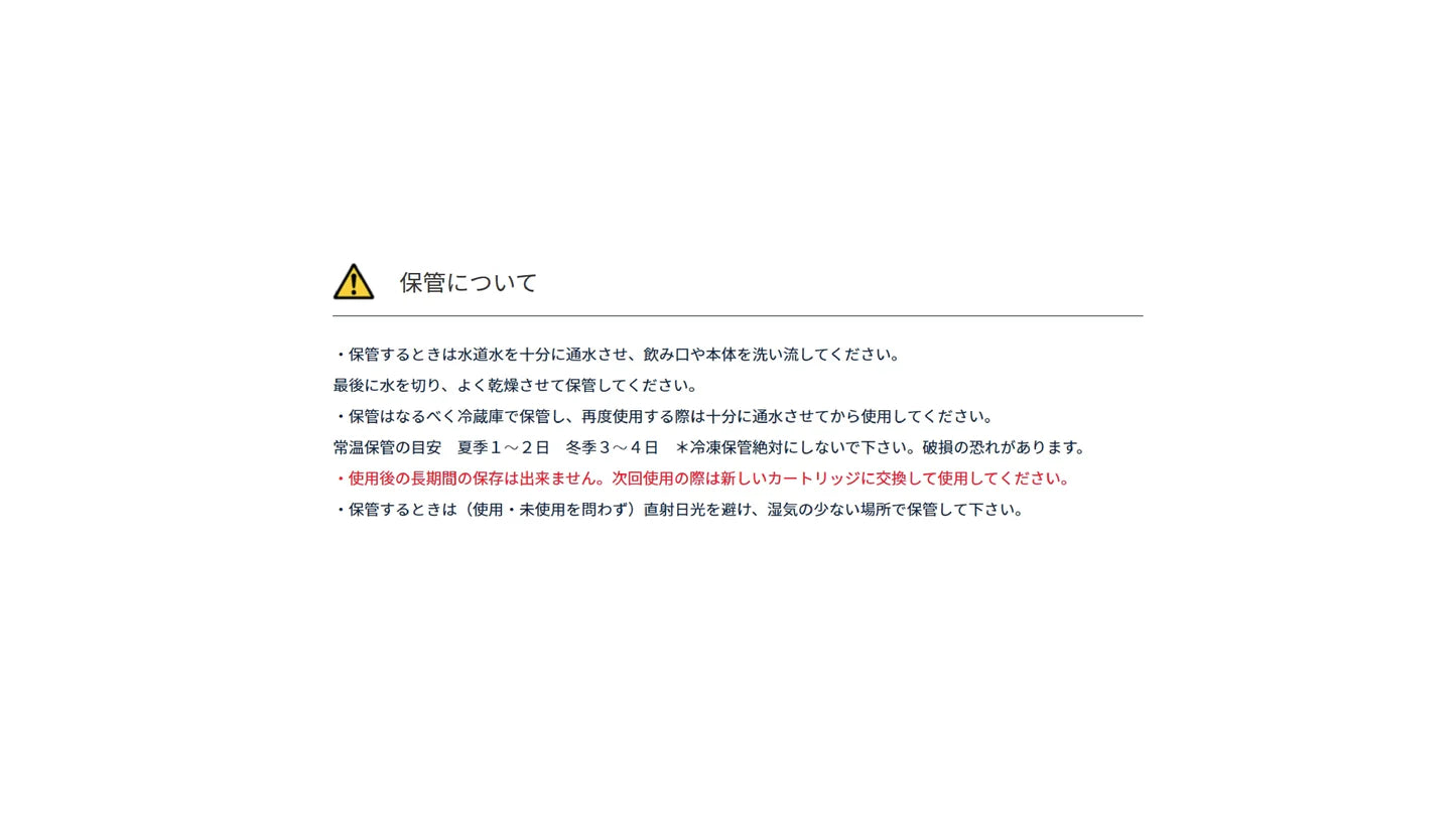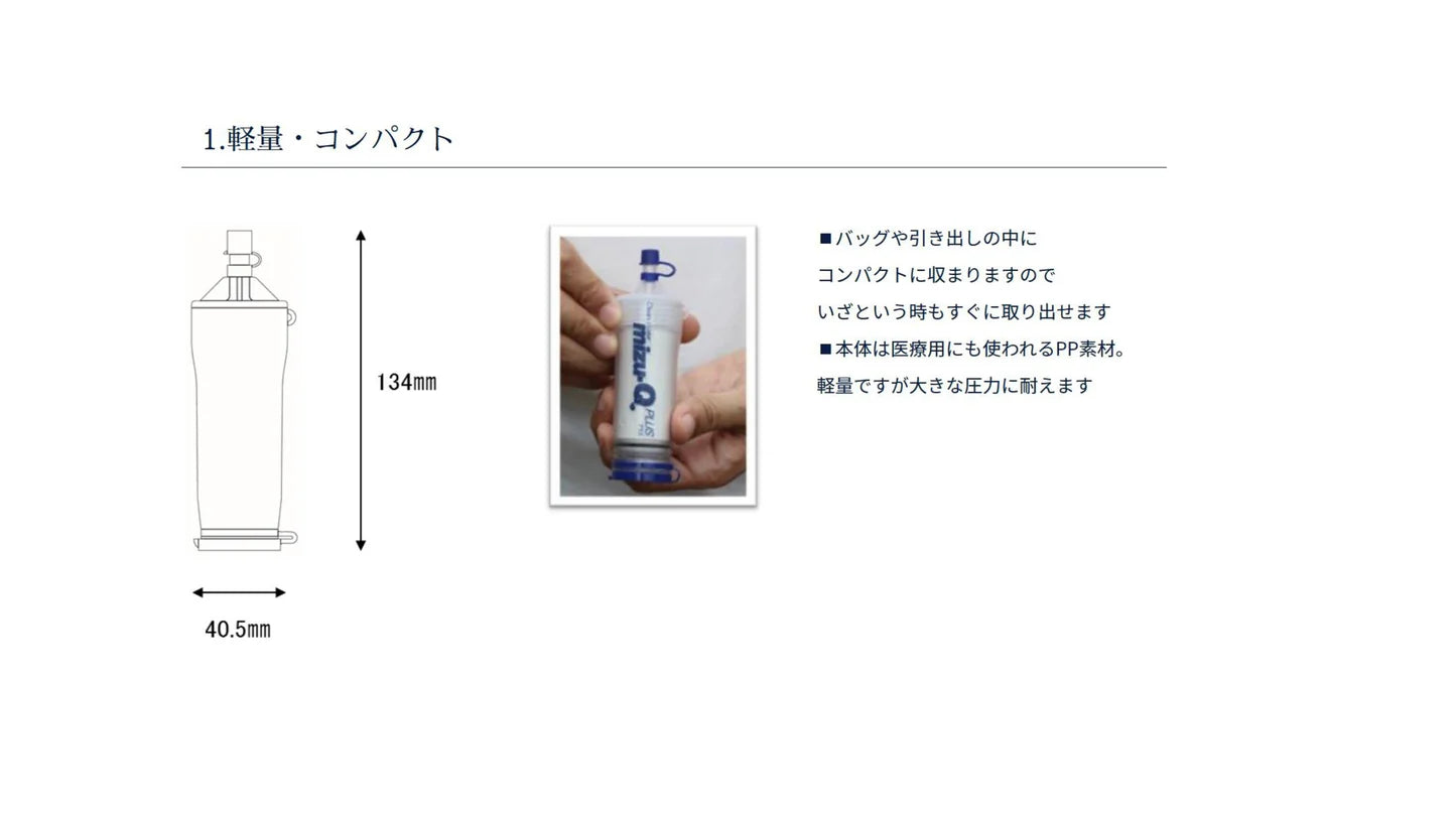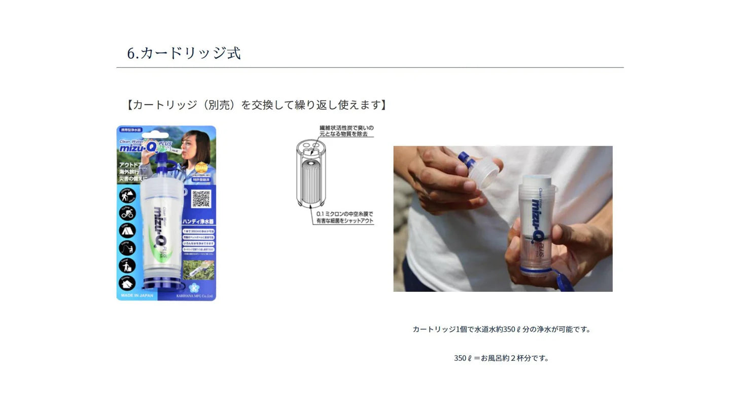 市販のペットボトルに装着できるハンディ浄水器。カートリッジ式で繰り返し使えて経済的。ご家庭で1本備えておくと安心です。