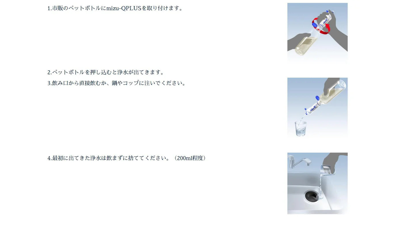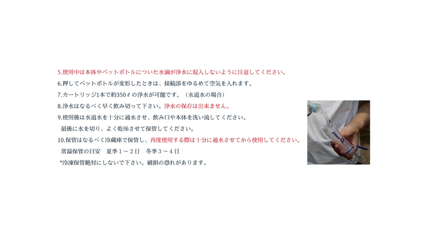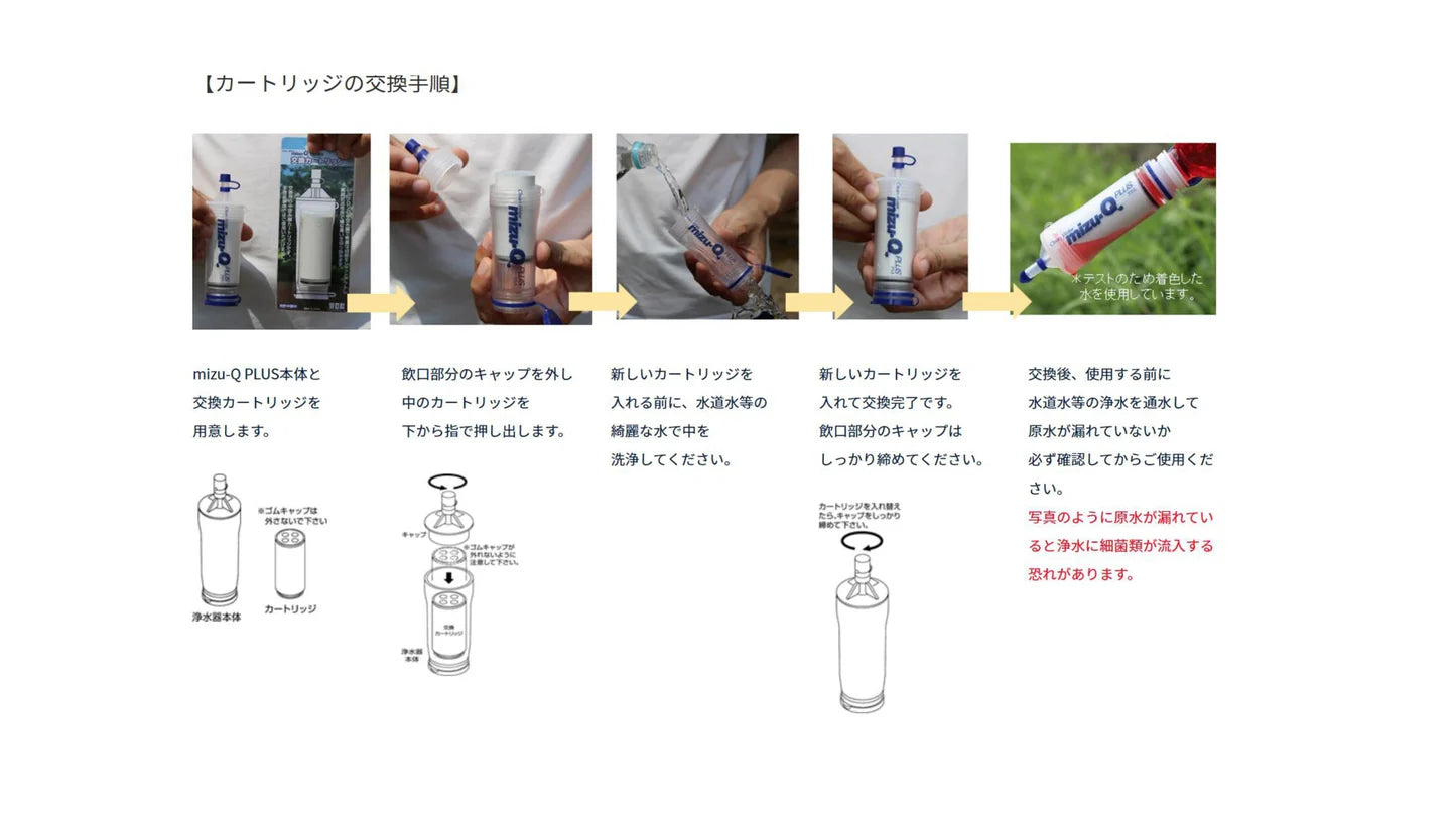 市販のペットボトルに装着できるハンディ浄水器。カートリッジ式で繰り返し使えて経済的。ご家庭で1本備えておくと安心です。