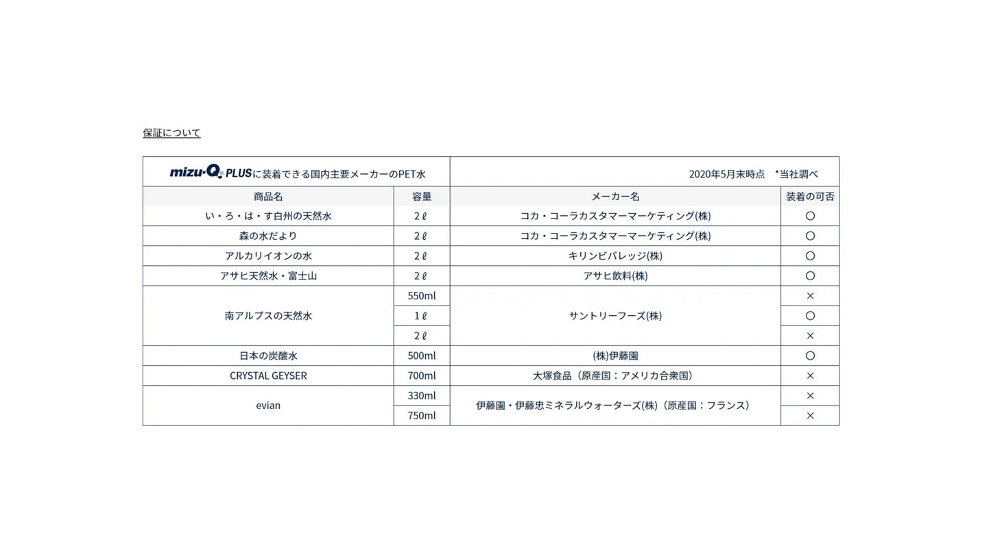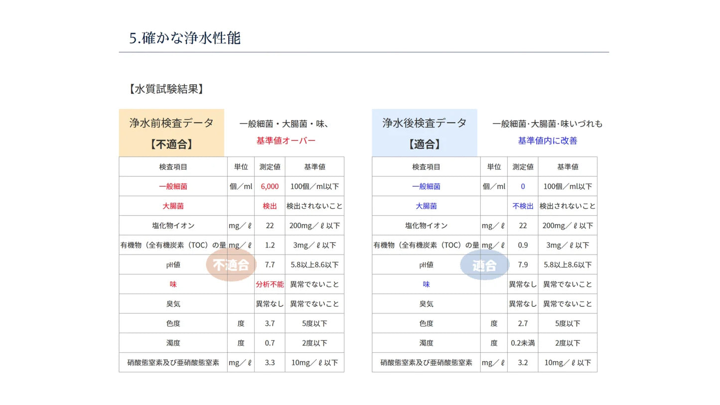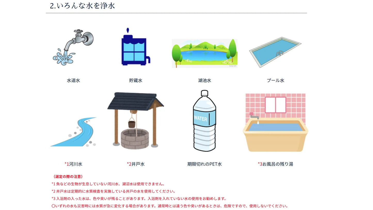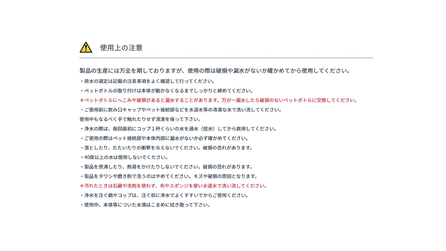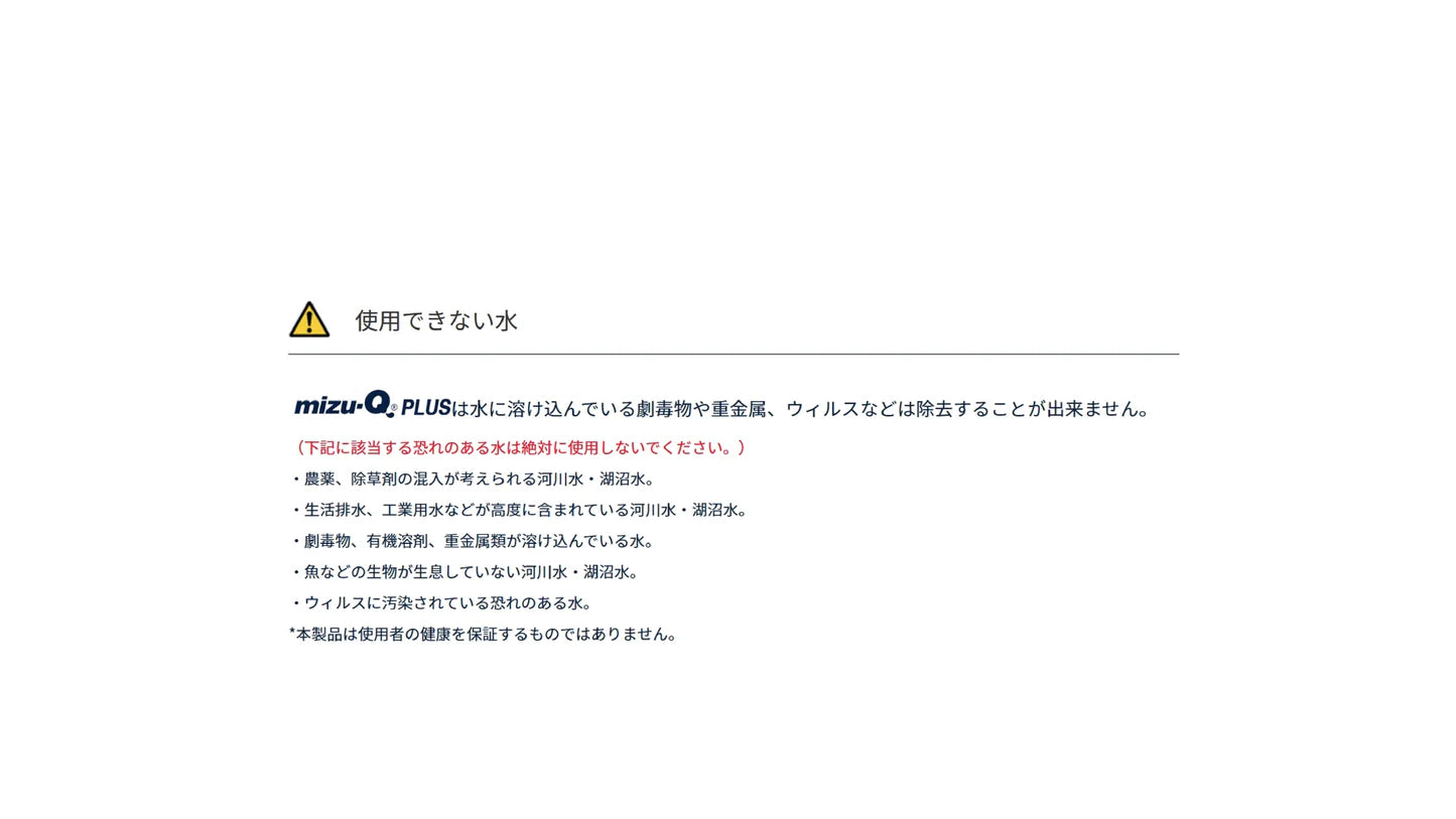 浄水不可:海水の淡水化、硬水の軟水化、農薬・毒劇物・有機溶剤、有機重金属などが溶け込んでいる恐れのある水、ウイルスに汚染されている恐れのある水